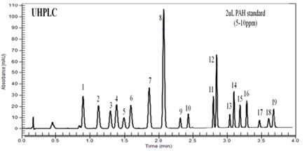 HPLC方法也廣泛用于PAHs的分離和分析,已成為監(jiān)測PAHs最重要、最為有效的方法之一。其常用紫外、熒光等檢測器進(jìn)行檢測。與GC、GC-MS方法比較,HPLC法不受PAHs揮發(fā)和熱穩(wěn)定性的限制,可用于分析包括GC不能分析的高沸點(diǎn)PAHs,分析范圍更寬。但傳統(tǒng)的LC分析方法通常耗時(shí)較長,消耗溶劑及產(chǎn)生的有害廢液也較多,比如HPLC分析19種PAHs一般需20min,同時(shí)需消耗25mL左右的乙腈。然而通過PerkinElmer開發(fā)的超高液相色譜(UHPLC)結(jié)合2um填料顆粒的色譜柱分析這19種PAHs,分析時(shí)間僅需約4mins,且可降低約90%的流動(dòng)相溶劑(乙腈)的消耗。