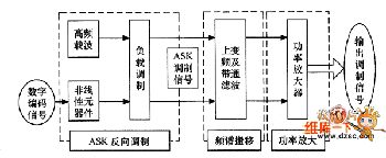 發(fā)送部分的主要功能是將控制部分處理好的數(shù)字編碼信號進行ASk幅度調(diào)制,進行放大后,送到天線端發(fā) 給讀寫器。它主要由ASk調(diào)制電路和放大器組成,發(fā)送部分的功能結(jié)構(gòu)如圖3所示。