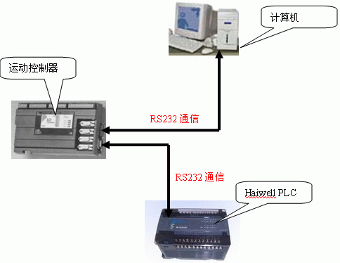 利用Haiwell PLC的易用的通信功能:標準配置2個通信口,1個RS232通信口,1個RS485通信口。用Haiwell PLC的 RS232口與運動控制器的RS232口通信,Haiwell PLC作為通信主站,運動控制器作為通信從站,便捷經(jīng)濟的實現(xiàn)運動控制器的IO擴展。