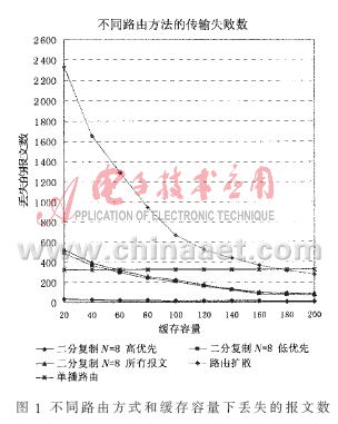 圖1反映的是數(shù)據(jù)包丟失的總數(shù)和緩存容量的關系。在單播路由下,由于不涉及到報文的復制,所以緩存容量對于系統(tǒng)性能沒有影響,丟失的數(shù)據(jù)包總數(shù)均為321個。路由擴散由于不限制報文的拷貝份數(shù),在早先時間生成的報文會被大量復制,占據(jù)緩存空間,這些報文在沒有到達目的地之前,阻止了后面生成的報文的復制傳輸,造成后續(xù)的報文難以到達目的地,在生存時間截止后被丟棄。在緩存容量較小的情況下,路由擴散方式丟失的報文數(shù)遠大于單播路由方式,證明其不適用于節(jié)點緩存容量較小的系統(tǒng)。隨著緩存容量的增加,路由擴散方式的丟包數(shù)大幅下降,最后小于單播路由的丟包數(shù)。說明當轉發(fā)緩存不被輕易占滿的情況下,多復制路由的性能會優(yōu)于單播路由方式。二分法復制則由于考慮到節(jié)點轉發(fā)緩存的容量,限制了報文復制的份數(shù)。在復制份數(shù)上限為8的情況下,所有報文的丟包數(shù)隨著轉發(fā)緩存容量的增加而減小,在轉發(fā)緩存容量為60時就低于單播路由方式的丟包數(shù),體現(xiàn)出明顯的性能優(yōu)勢。尤其是高優(yōu)先級的報文,丟包數(shù)一直穩(wěn)定在30個以下,小于10%的丟包率,并隨著轉發(fā)緩存容量的增加進一步減小,在緩存容量為200時丟包率小于3%。低優(yōu)先級的報文在緩存容量為20時丟包率為18.1%,隨著緩存容量增加到200,丟包率減小到3%左右,和高優(yōu)先級的報文相當。這說明在緩存容量足夠的情況下,優(yōu)先級的高低造成的丟棄或保留對于系統(tǒng)已經幾乎沒有影響,報文的丟失主要是因為路徑完全不可達。而在緩存容量較小的情況下,高優(yōu)先級的報文的丟包率明顯小于低優(yōu)先級的,說明該路由與緩存管理策略對緊急數(shù)據(jù)的傳輸有較好的支持。