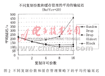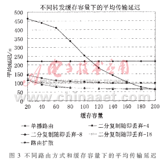 圖2 比較了三種不同的緩存管理策略的平均傳輸延遲表現(xiàn)。轉發(fā)緩存容量固定為20,在復制許可份數(shù)較小的情況下,三種緩存管理策略的差異不大。拒絕接受新報文方式在復制許可數(shù)超過4之后延遲反而增加,說明先前的報文沒發(fā)送出去時,后面的報文無法被復制、傳輸,直接增加了這些報文的延遲,所以出現(xiàn)性能下降。當選擇兩種丟棄方式后,報文的平均傳輸延遲在復制許可份數(shù)為8時獲得最低值,而在復制許可份數(shù)為16時平均延遲略有增加。說明在轉發(fā)緩存容量為20時,太多的復制許可份數(shù)反而造成部分報文被不必要地大量復制,而有些報文得不到復制機會,反而影響了總的平均延遲。8份復制許可的二分法復制方式是最為合適的。由于隨機丟棄方式在總體上丟棄已經被復制較多次數(shù)的報文的概率大一些,而被復制次數(shù)少的報文被隨機選中丟棄的概率小一些,這從一定程度上保證了公平,使那些后來的報文剛開始能多保留一些備份進行傳輸,所以性能略優(yōu)于丟棄最早報文方式。