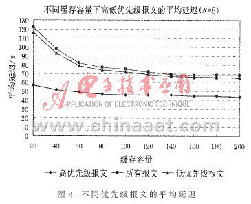 最后在N=8的情況下比較高低兩種優(yōu)先級報文的平均延遲。由圖4可以看出,本文中針對不同優(yōu)先級報文的處理方式保證了無論緩存容量充裕與否,高優(yōu)先級報文的平均延遲都明顯小于低優(yōu)先級報文,在緩存容量較小的情況下,這種優(yōu)勢尤為明顯。