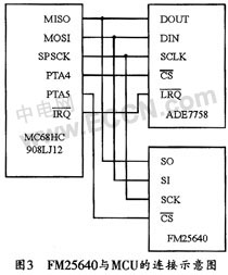 本設(shè)計(jì)中的單片機(jī)選擇MOTOROLA公司的MC68HC908LJ12,這是一款適用于電表設(shè)計(jì)的MCU,內(nèi)含12KBFlash存儲(chǔ)器并可在線編程。 同時(shí)還具有一個(gè)帶有紅外功能的串行通信接口SCI,一個(gè)高速SPI,8個(gè)鍵盤輸入中斷,以及內(nèi)部LCD驅(qū)動(dòng)模塊,因而節(jié)省了外掛液晶驅(qū)動(dòng)芯片。系統(tǒng)中的電 能計(jì)量芯片則選擇美國(guó)ADI公司的三相電能計(jì)量芯片ADE7758,該芯片精確度高,可以提供有功功率、無(wú)功功率、視在功率、電壓有效值和電流有效值等多 項(xiàng)數(shù)據(jù),具有兩路脈沖輸出,同時(shí)也帶有SPI串口。由于SPI接口可支持多個(gè)器件掛在同一個(gè)總線上,并可通過(guò)片選信號(hào)區(qū)分每一個(gè)器件,因此,將 FM25640和ADE7758都通過(guò)SPI接口與單片機(jī)MC68HC908LJ12相連,并將MC68HC908LJ12的兩個(gè)I/O口PTA4、 PTA5分別與FM25640和ADE7758的片選端CS相連接,就可以實(shí)現(xiàn)片選。其具體的連接電路如圖3所示。