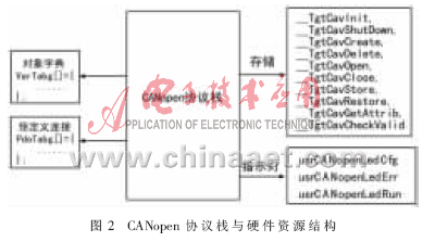 按照CANopen協(xié)議DS303-3的定義,CANopen從站需要使用兩種顏色的LED指示燈來指示運(yùn)行和錯(cuò)誤狀態(tài),運(yùn)行指示燈使用綠色,錯(cuò)誤指示燈使用紅色,根據(jù)實(shí)際硬件來設(shè)置LED控制端口。協(xié)議棧通過調(diào)用如表1所示的3個(gè)函數(shù)來實(shí)現(xiàn),配置文件與協(xié)議棧結(jié)構(gòu)如圖2所示。