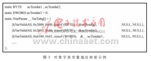 對(duì)于對(duì)象字典索引在0x1000~0x1FFF范圍內(nèi)的對(duì)象字典,其變量存儲(chǔ)地址已經(jīng)在協(xié)議棧中預(yù)定義,不需要開發(fā)者再次定義。索引在0x2000~0x9FFF之間的索引,需要重新映射變量地址,否則對(duì)象字典無法正確存儲(chǔ)數(shù)據(jù)。在TinyARM CANopen中,為了使開發(fā)者方便映射對(duì)象字典變量,在文件名為usrcoppardef.c的文件中定義了一個(gè)參數(shù)數(shù)組__VarTabg,將需要定義的對(duì)象字典變量地址添加到該表格中即可,其格式與使用示例如圖3所示。