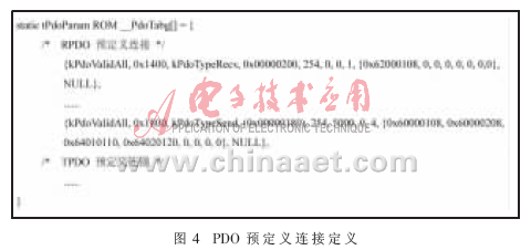 在CANopen運(yùn)行時(shí)通常采用DS301所建議的預(yù)定義連接COB-ID(通信對(duì)象標(biāo)識(shí)),其中預(yù)定義連接集包括PDO、SDO、NMT、SYNC以及EMCY等服務(wù)。協(xié)議棧在啟動(dòng)時(shí)已經(jīng)將(除RPDO和TPDO以外)一些服務(wù)的COB-ID設(shè)定為預(yù)定義連接,開發(fā)者只需要重新設(shè)定RPDO和TPDO的預(yù)定義連接即可。同樣開發(fā)者只需要在PDO預(yù)定義表格中添加項(xiàng)目即可,實(shí)現(xiàn)示例如圖4所示。