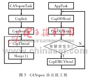 如圖5所示為CANopen協(xié)議棧工作流程圖,其中CopInit為初始化CANopen協(xié)議棧,CopBootUp發(fā)送CANopen啟動(dòng)信息并且進(jìn)入預(yù)操作狀態(tài),CopThread 為CANopen協(xié)議棧線程函數(shù),需要應(yīng)用程序循環(huán)調(diào)用。開發(fā)者可以通過CopODRead和CopODWrite對(duì)對(duì)象字典進(jìn)行讀寫操作。