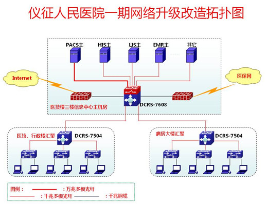 儀征人民醫(yī)院在2003年采用神州數(shù)碼網(wǎng)絡(luò)公司的網(wǎng)絡(luò)設(shè)備建設(shè)了以千兆以太網(wǎng)技術(shù)為主干的醫(yī)療信息化網(wǎng)絡(luò),實(shí)現(xiàn)了HIS系統(tǒng)的應(yīng)用。