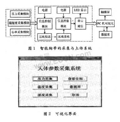 傳統(tǒng)的有線傳輸方式嚴(yán)重影響日常的起居生活,難以做到隨時(shí)隨地監(jiān)測(cè),智能胸帶的可移動(dòng)性使用戶能夠在自由運(yùn)動(dòng)中使用,并具有可再編程能力、無線通信能力、操作和交互的連續(xù)性等特性,并且整個(gè)計(jì)算機(jī)同使用者融為一體,可以隨著穿戴者任意移動(dòng)。智能胸帶的研發(fā)是服裝功能性與舒適性的一個(gè)分支,是以智能胸帶的硬件系統(tǒng)為基礎(chǔ),通過軟件編程進(jìn)行硬件操作,實(shí)現(xiàn)即時(shí)的人體的生理參數(shù)即心率、壓力、溫度和濕度的采集,并且采用無線傳輸?shù)姆绞桨褱y(cè)量到的數(shù)據(jù)傳輸?shù)斤@示設(shè)備或者計(jì)算機(jī)中,另外實(shí)現(xiàn)可視化功能,后臺(tái)的數(shù)據(jù)庫可以實(shí)現(xiàn)數(shù)據(jù)的即時(shí)查看與存儲(chǔ)。