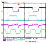 圖7. MAX5073雙buck轉(zhuǎn)換器的輸入紋波、開關(guān)波形測(cè)試結(jié)果,轉(zhuǎn)換器分別工作在2.2MHz開關(guān)頻率,輸入電容紋波的的頻率為4.4MHz (CH1 = 第2路時(shí)鐘源; CH2 = 第1路時(shí)鐘源; CH3 = 輸入電容紋波; CH4 = 時(shí)鐘輸出)。