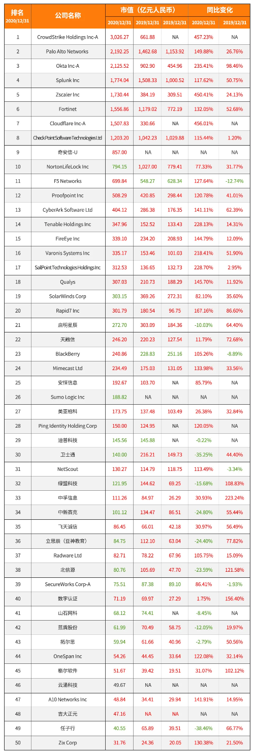 全球?qū)I(yè)網(wǎng)絡(luò)安全廠商市值排行TOP50(統(tǒng)計截至2020年12月31日)