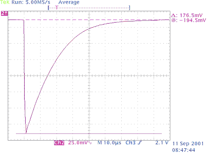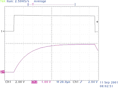 首先,我們得測量與A/D輸入端相連的電容值(C = CO + CT + CP)。我們先對輸入電阻施加一個方波信號,然后通過顯示屏觀察結(jié)果波形的時間常數(shù)(如圖4)。我們可以從顯示屏上直接推算出這一時間常數(shù),但最好把數(shù)據(jù)輸入到excel中以求計算結(jié)果更精確。在圖4的例子中,時間常數(shù)大約為28.5μs。