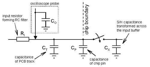 眾所周知,芯片制造商通常不能為設(shè)計師提供足夠的數(shù)據(jù)。我看過許多A/D轉(zhuǎn)換器的datasheet,發(fā)現(xiàn)它們都沒有提供采樣過程中輸入電容的變化數(shù)據(jù)。但我們能夠通過測量輕松得到這個參數(shù),而測量所需要的設(shè)備僅為一臺示波器和一臺信號發(fā)生器。值得說明的是,這一簡單測量的結(jié)果并不準(zhǔn)確,但至少可以讓我們粗略地估計出這一參數(shù)值。我們可以通過觀測芯片引腳的壓降,計算出電容值的變化情況。