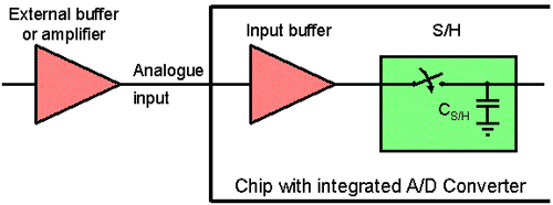 A/D轉(zhuǎn)換器的輸入端與一個外部放大器相連。由于采樣過程非常迅速,比外部放大器的帶寬快得多,因此無論A/D轉(zhuǎn)換器的輸入端怎樣變化,都不受外部放大器的影響。