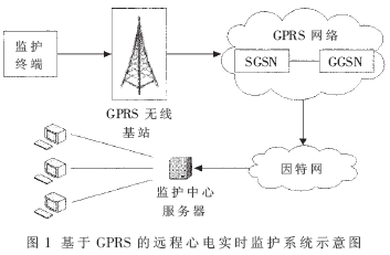 基于GPRS的遠程心電實時監(jiān)護系統(tǒng)示意圖如圖1所示。它主要包括兩部分:心電監(jiān)護終端和醫(yī)院監(jiān)護中心?;颊唠S身攜帶的監(jiān)護終端由它上面的無線模塊" title="無線模塊">無線模塊通過GPRS無線基站接入GPRS網絡,再通過GPRS網絡連接因特網上的監(jiān)護中心服務器。監(jiān)護終端采集并處理患者的心電信號,所得到的心電數據通過該鏈路傳輸到監(jiān)護中心服務器上,并由服務器上的心電分析軟件進行分析,醫(yī)生則根據軟件分析結果及自己的判斷來給患者適當的醫(yī)囑,必要時采取相應的救治措施。