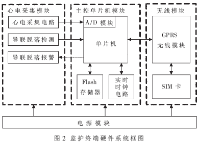 監(jiān)護終端硬件系統(tǒng)框圖如圖2所示,它主要由以下幾部分組成:心電采集模塊、主控單片機模塊、GPRS無線通信模塊和電源模塊。