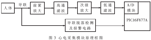 人體心電信號的主要頻率范圍為0.05~100Hz,幅值范圍為0.5~5mV。心電信號中通?;祀s有其他生物電信號,還容易受到以50Hz工頻干擾為主的電磁信號干擾,因此對心電信號的檢測屬于強噪聲背景下低頻微弱信號的檢測。為得到適合于臨床應用的干凈心電信號,必須對心電信號進行合理的放大和濾波處理,其原理框圖如圖3所示。