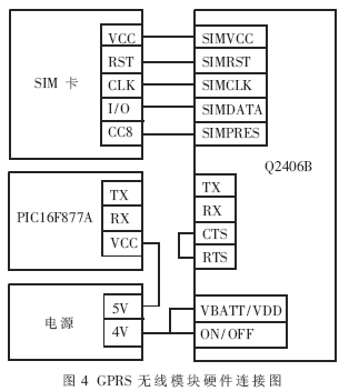 GPRS無線模塊采用Wavecom公司的WISMO Quik Q2406B。該模塊工作頻帶為雙頻EGSM 900/GSM 1800MHz或GSM 850/GSM 1900MHz,支持GPRS多時隙class 10,可提供語音、數據、傳真和短信息服務功能。模塊射頻部分和基帶部分可共用一個電源,電壓范圍為3.3V~4.5V[5]。模塊基帶部分內嵌了GSM/GPRS協(xié)議棧,是否嵌入TCP/IP協(xié)議棧可由用戶選擇。根據系統(tǒng)需要,這里選擇了內嵌TCP/IP協(xié)議棧的模塊。