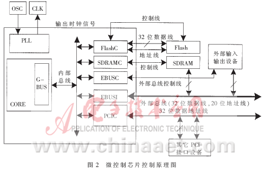 ??? MIPS通過內(nèi)部的FlashC和SDRAMC實現(xiàn)對外圍Flash和SDRAM的控制,其中SDRAM的數(shù)據(jù)地址線要與外部總線控制接口(EBUSI)連接,F(xiàn)lash的數(shù)據(jù)地址線連接到對應(yīng)的FlashC的數(shù)據(jù)地址端口。MIPS通過PCI總線控制器(PCIC)控制其他PCI接口設(shè)備,其控制原理圖如圖2所示。