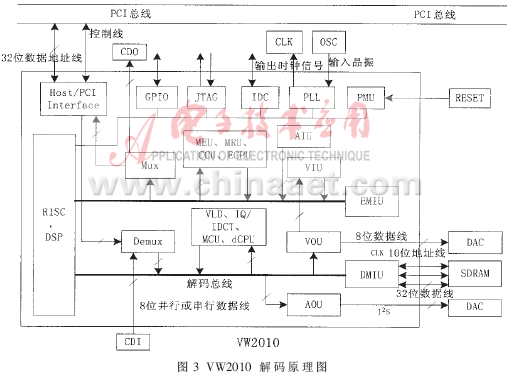 ??? VW2010有PCI、GPIO、I2S和CDI等多種數(shù)據(jù)接口,解碼輸入端口有兩個:Host/PCI port和CDI(Compress Data Input)port。CDI port還分串行和八位并行兩種輸入方式。解碼原理圖如圖3所示。