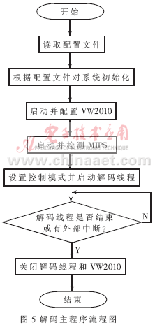 ??? 以IDE硬盤文件解碼為例,解碼程序主要由兩部分組成:主程序和解碼線程程序。解碼線程程序主要控制MPEG-4數(shù)據(jù)流的傳輸,先從數(shù)據(jù)源(IDE接口硬盤)獲取MPEG-4數(shù)據(jù)流文件,再以塊的方式將數(shù)據(jù)傳送至W2010進(jìn)行數(shù)據(jù)流的解碼,然后在檢測外部中斷信號同時不斷地把文件中的數(shù)據(jù)以塊的方式寫入VW2010,直到文件終止或者外部信號中斷解碼過程。解碼過程相對獨立。為便于其后臺用使用線程的方式實現(xiàn),線程的級別要設(shè)為最高[5]。主程序主要進(jìn)行系統(tǒng)初始化工作,內(nèi)容包括讀取解碼參數(shù),配置SAA7129的寄存器,啟動并檢查MIPS,開啟VW2010并加載配置文件等。