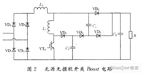 圖2所示為無(wú)源軟開(kāi)關(guān)Boost電路、串聯(lián)電感及無(wú)損SNUBBER電路。與普通的Boost電路相比,增加電感L1限制因VD0的反向恢復(fù)而產(chǎn)生的VT0開(kāi)啟沖擊電流,C2→VD7作為VD0的SNUBBER電路,VD5→VD6→VD7的串聯(lián)結(jié)構(gòu)和L1→C1→C2之間的諧振與能量轉(zhuǎn)換也有利于抑制VT0的開(kāi)啟沖擊電流。