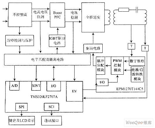 控制系統(tǒng)主要采用Altera公司的MAXⅡ系列CPLD芯片EPMl270T144C5和TI公司的TMS320LF2407A型DSP??刂骗h(huán)節(jié)由數(shù)字鎖相環(huán)、PWM控制模塊、分時(shí)脈沖控制模塊、DSP移相功率調(diào)節(jié)環(huán)節(jié)以及DSP-PFC環(huán)節(jié)組成。CPLD鎖相環(huán)模塊跟蹤負(fù)載諧振頻率,同時(shí)接收DSP輸出的數(shù)字移相角大小,從而經(jīng)PWM、分時(shí)模塊計(jì)算輸出8路移相觸發(fā)脈沖。DSP計(jì)算負(fù)載輸出功率,與功率設(shè)定值比較,經(jīng)積分分離PI算法輸出移相角度;DSP還要對(duì)CCM模式下的軟開(kāi)關(guān)Boost電路進(jìn)行平均電流控制。此外還要實(shí)現(xiàn)設(shè)置、保護(hù)以及顯示等功能。