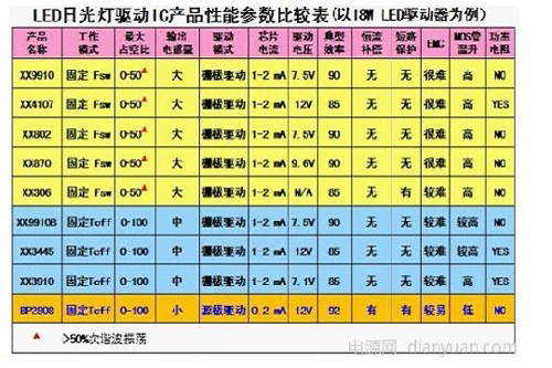 如是設(shè)計(jì) AC85V--264V 全電壓輸入,又要考慮 PFC,可將 LED 光源陣列設(shè)計(jì)成 0.06W 白光 LED 12 個(gè)串聯(lián)、24 串并聯(lián)方案。目前可使用的 LED 日光燈驅(qū)動(dòng) IC 有好幾種,其性能參數(shù)都有差異,現(xiàn)列表2 供設(shè)計(jì)選型參考。從中可見 BP2808 的固定 Toff 工作模式、100%占空比、芯片工作電流僅 0.2mA、效率達(dá) 92%、恒流補(bǔ)償和使用獨(dú)特的源極驅(qū)動(dòng)模式等特性,使其具有適用于 LED 照明燈具的明顯優(yōu)勢。(電源網(wǎng)原創(chuàng)轉(zhuǎn)載請注明出處)