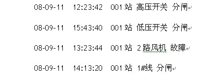運(yùn)行故障報警主要為箱變內(nèi)部高壓開關(guān)狀態(tài)實(shí)時監(jiān)控和變位報警;報警內(nèi)容如圖4所示,包括:故障報警產(chǎn)生日期時間,站號,回路名稱,報警內(nèi)容等信息;報警范圍為高低壓主斷路器實(shí)時監(jiān)測,故障報警,變位報警;饋線斷路器狀態(tài)實(shí)時監(jiān)測及開關(guān)變位報警;各饋線回路的漏電報警;箱變內(nèi)部溫度異常報警;風(fēng)機(jī)故障報警;及運(yùn)行電壓的缺相和不平衡報警等報警信息組成。該報警信息主要通過智能元器件對箱變數(shù)據(jù)進(jìn)行實(shí)時采集、運(yùn)算、通訊上傳至由智能通訊服務(wù)器,再由通訊服務(wù)器進(jìn)行運(yùn)算、分析判斷;最后利用GPRS modem把有效的報警信息通過GSM網(wǎng)絡(luò)發(fā)送至指定用戶手機(jī);使用戶及時響應(yīng)故障報警,縮短故障恢復(fù)時間。同時考慮到GSM網(wǎng)絡(luò)繁忙和用戶手機(jī)是否在線等因素,支持報警信息多用戶,多次間隔發(fā)送。保證信息及時傳輸至用戶,增強(qiáng)系統(tǒng)運(yùn)行的安全指數(shù)。