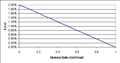 圖2顯示了輸出精度,其為參考電壓與輸出電壓對(duì)比關(guān)系的函數(shù)。簡(jiǎn)化之后,分壓器精度為(1–Vref/Vout)*2*容差,其與我們通過檢查得到的三個(gè)數(shù)據(jù)點(diǎn)相關(guān)。我們對(duì)該方程式進(jìn)行了一些簡(jiǎn)化處理,但對(duì)大多數(shù)電阻容差來說都應(yīng)該足夠精確。