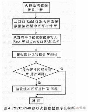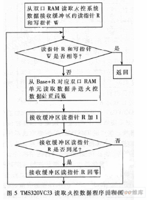 在本系統(tǒng)中,所有對(duì)外部系統(tǒng)的通信工作均由從機(jī)TMS320F240通過(guò)擴(kuò)展串口ST16C554來(lái)完成??紤]到整個(gè)系統(tǒng)的數(shù)據(jù)處理流程及時(shí)序要求,在TMS320F240的軟件設(shè)計(jì)中,數(shù)據(jù)接收采用中斷方式,數(shù)據(jù)發(fā)送則是在軟件的主流程內(nèi)部維持一個(gè)無(wú)限循環(huán),將發(fā)送程序駐留在此循環(huán)中,通過(guò)查詢發(fā)送緩沖區(qū)的讀、寫指針,實(shí)時(shí)發(fā)送數(shù)據(jù)。ST16C554共有四個(gè)串口,分別負(fù)責(zé)與前述四個(gè)外部系統(tǒng)的數(shù)據(jù)通信。主機(jī)TMS320VC33只需對(duì)雙口RAM中相應(yīng)的數(shù)據(jù)緩沖區(qū)寫入要發(fā)送的數(shù)據(jù)或讀取需要的數(shù)據(jù)即可。鑒于主、從機(jī)對(duì)這四種類型數(shù)據(jù)的存取操作程序類似,在此只給出TMS320F240接收火控系統(tǒng)數(shù)據(jù)和TMS320VC33讀取火控系統(tǒng)數(shù)據(jù)的程序流程圖,分別如圖4和圖5所示。其中,Base為火控系統(tǒng)數(shù)據(jù)接收緩沖區(qū)數(shù)據(jù)存取基地址。