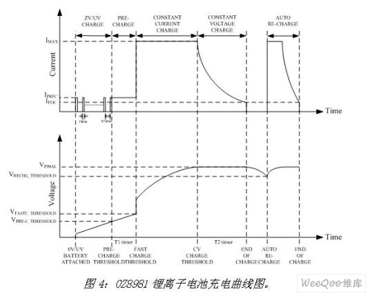 圖4為OZ8981鋰離子電池充電曲線圖。通過與前端PWM芯片的結(jié)合,OZ8981將幫用戶快速的實現(xiàn)安全高效且低成本的鋰離子電池充電器設(shè)計。