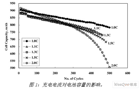 下面是一個4.2V/900mAH LiCoO2電芯的不同電流充電與電池容量的關(guān)系曲線(圖1),我們可以看出大約500個充放周期后,小電流充電的電池容量明顯大于大電流充電的電池容量。