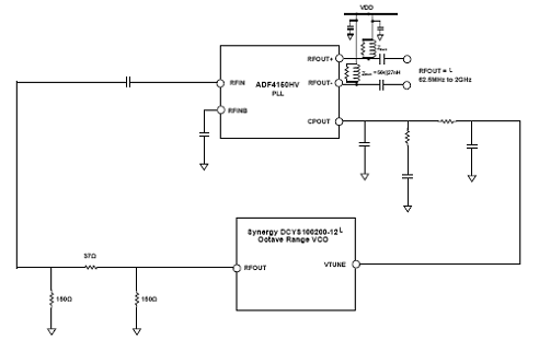 圖2.采用ADF4150HV和VCO的超寬帶PLL電路圖