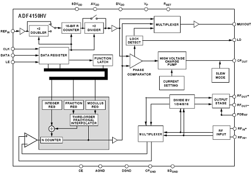The ADF4150HV is a 4.4 GHz fractional-N or integer-N frequency synthesizer with an integrated high voltage charge pump. The synthesizer can be used to drive external wide band VCOs directly, removing the need for operational amplifiers to achieve higher tuning voltages. This simplifies design and reduces cost while improving phase noise, as active filter topologies tend to degrade phase noise when compared to passive filters.