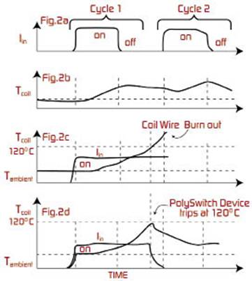 圖2 PolySwitch器件通過(guò)限制線(xiàn)圈電流防止過(guò)流/過(guò)溫造成的損壞