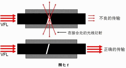 一般光纖切割后,典型的切割角度為1-3度,即便使用更精密的切割刀,光纖切割后仍然有0.5-1度的偏角。出現(xiàn)偏角的情況可以通過使用可見紅光源(VFL)輸入,并且緩慢旋轉(zhuǎn)被切割的光纖端面,在PROclick連接頭的可視窗口內(nèi)監(jiān)視直到紅光消失的方法來解決。如圖七f。