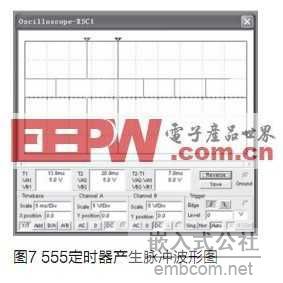 后一級電路由兩個(gè)555定時(shí)器組成,其中下方的555構(gòu)成一個(gè)占空比非常接近于1的脈沖發(fā)生器,作為上方555的觸發(fā)脈沖。因?yàn)榇擞|發(fā)脈沖的低電平信號非常窄,所以能很好的保證上方555構(gòu)成的單穩(wěn)態(tài)電路正常運(yùn)行。波形如圖7所示。該脈沖信號頻率為: