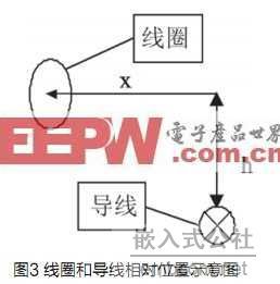 本設(shè)計(jì)中順著電流方向豎直放置線圈,這是由于對于放置在導(dǎo)線上方h處的,與導(dǎo)線水平距離為x的線圈(如圖4示)中產(chǎn)生的感應(yīng)電動勢大小與 成正比,其中q是傳感器所在平面與導(dǎo)線的夾角。由于車身可能會與導(dǎo)線成一定的夾角,因此q不一定為0。