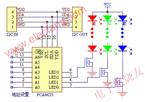 下圖為驅(qū)動(dòng)單元的設(shè)計(jì),其中紅綠藍(lán)3色LED的數(shù)量可以是多個(gè)的,根據(jù)自己的設(shè)計(jì)要求可以選擇并聯(lián)或串聯(lián)的方式,再按照LED的連接方式及電壓/電流等要求選擇適合的開關(guān)管即可,少量的LED也可用PCA9633直接驅(qū)動(dòng),具體參數(shù)見PCA9633資料。驅(qū)動(dòng)模塊通過PCA9633的A6~A0管腳設(shè)定訪問地址,接到控制模塊輸出的I2C總線上就可正常工作,每條I2C總線可接126塊調(diào)光驅(qū)動(dòng)模塊。
