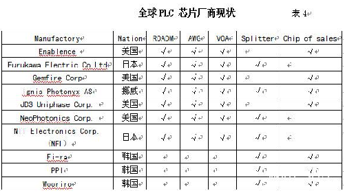 目前中國(guó)已經(jīng)是PLC器件的制造大國(guó),全球的產(chǎn)品大都在中國(guó)和韓國(guó)生產(chǎn)。國(guó)內(nèi)可生產(chǎn)光分路器企業(yè)有百家左右(包括外資企業(yè)),具備生產(chǎn)及研發(fā)能力的有20家左右(從中國(guó)電信2010年P(guān)LC集采信息中,全國(guó)共有近百家企業(yè)參加集采投標(biāo)),其中烽火通信、武漢光迅科技、博創(chuàng)科技、富創(chuàng)光電、奧康光通器件、無(wú)錫愛(ài)沃富、富春江光電、深圳日海通訊、成都飛陽(yáng)科技、上海上誠(chéng)、大唐通訊(昆山)、南京普天、浙江普森等企業(yè)成規(guī)模生產(chǎn),除了芯片外購(gòu)?fù)?,其他均由自己生產(chǎn)。除此之外大部分企業(yè)不管是在產(chǎn)品品種還是在生產(chǎn)規(guī)模上尚未形成大的氣候,并且部分企業(yè)基本上是分路器主體買進(jìn),然后加跳線頭子和外殼組裝模式。