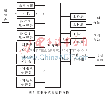 本文所設計的VCM磁鋼快速檢測控制系統(tǒng)主要是與快速智能檢測系統(tǒng)中的機械、氣動及檢測部分相結合,利用單片機控制技術[2]實現VCM磁鋼快速智能檢測系統(tǒng)的上料、分揀與下料等動作??刂葡到y(tǒng)的結構框圖如圖1所示,在檢測設備控制系統(tǒng)中,主要輸入部分有急停按鈕開關、PC機通信、步進電機的限位開關、上料下料的限位開關等,主要輸出部分有上料下料氣缸和步進電機等裝置??刂圃硎菃纹瑱C通過采集輸入量的信號,對上料下料氣缸和步進電機等輸出元件進行相應的控制,實現VCM磁鋼上料、檢測、下料的快速智能檢測過程。