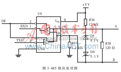 485模塊主要是實現控制系統(tǒng)與PC機中的上位機軟件進行通信,接收上位機發(fā)送過來的動作按鈕及檢測結果,反饋給MCU模塊,由單片機對氣動部分和步進電機進行控制,實現上位機響應的動作指令。其原理圖如圖3所示。