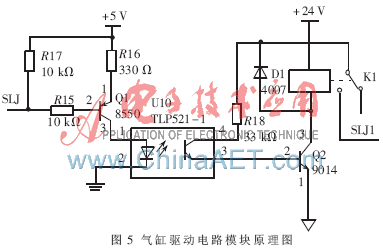 輸出電路模塊主要由4路氣缸驅動模塊和2路步進電機的驅動模塊組成,其原理圖分別如圖5、圖6所示。4路氣缸驅動模塊分別用來驅動上料氣缸的上料進和上料退、下料氣缸的下料進和下料退。2路步進電機驅動模塊用來控制步進電機的脈沖和方向。通過單片機對這些輸出模塊的控制,從而實現VCM磁鋼快速智能檢測系統(tǒng)的上料、分揀和下料動作。
