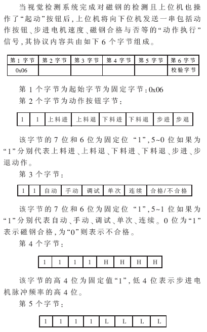 單片機控制系統(tǒng)的軟件主程序流程如圖7所示。首先要進行系統(tǒng)的初始化,主要完成對單片機端口的初始狀態(tài)和一些變量的初始值的設定,同時也要對串口及中斷進行初始化,完成串口通信速率及中斷使能等初始設置。系統(tǒng)先對輸入的開關量進行掃描,然后執(zhí)行上料進,將磁鋼推至相機下方,并向上位機發(fā)送上料到位信號。如果上位機接收到上料到位信號,就會回復確認信號,如果此時上位機已經執(zhí)行了相應的操作,隨后上位機就會將這些操作命令以字符串形式發(fā)送給下位機。如果下位機接收到的是上位機的停止信號,則馬上停止當前的動作,等待下一個命令的動作。而且由于控制系統(tǒng)執(zhí)行了停止操作,所以系統(tǒng)要先執(zhí)行一次起動操作,才能使系統(tǒng)復位,重新接收并執(zhí)行新的動作命令。如果前面接收到的不是停止命令,而是起動命令,首先要判斷運行模式。如果是自動模式,則要判斷磁鋼是否合格,如果合格,則執(zhí)行下料進動作,將合格品推至合格料箱里。如果是不合格品,則先要執(zhí)行步進電機的進動作,然后執(zhí)行下料進動作,將不合格品推至不合格料箱里。如果在自動模式中選擇的是單次動作,那么,至此就分別完成一個合格品和不合格品的上料、分檢、下料動作。如果選擇的是連續(xù)動作,則系統(tǒng)接下來將會循環(huán)地執(zhí)行上面的動作,直到接收到上位機的停止命令或控制板上的急停操作為止。如果是處于調試模式,則相當于執(zhí)行一次不合格品的操作過程,即先要執(zhí)行步進電機的進動作,然后執(zhí)行下料進動作,將不合格品推至不合格料箱里。如果系統(tǒng)是處于手動模式,則系統(tǒng)執(zhí)行上位機發(fā)送過來的相應的上料進、上料退、下料進、下料退、步進、步退中的一種動作,然后再進行下一輪新的動作過程。其中,步進電機的速度是根據上位機發(fā)送過來的步進電機的脈沖頻率來確定的。另外,單片機系統(tǒng)和上位機之間的數據交換都是通過串口實現的。由于采用的是RS485通信,所以單片機系統(tǒng)和上位機之間只能進行半雙工通信,所以,雙方之間的收和發(fā)的協(xié)調很重要,否則會引起通信中斷,導致系統(tǒng)死機。為保證系統(tǒng)的可靠性,除了在硬件設計上加強隔離、屏蔽、濾波、抑制等措施外,還在軟件設計上通過在程序中適當的位置設置軟件看門狗來增強軟件的抗干擾,當程序受到干擾跑飛或進入死循環(huán)時,能將程序強制復位。