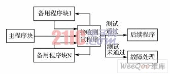 另一種是RB(Recovery Block,恢復快結(jié)構(gòu)),它是Randell于1975年在參考文獻[7]中提出的一種的軟件容錯技術,它是一種動態(tài)冗余方法。在RB結(jié)構(gòu)中,有主程序塊和一些備用程序塊構(gòu),這里的主程序塊和備用程序塊采用不同編程方法但具有相同的功能。每個主程序塊都可以用一個根據(jù)同一需求說明設計的備用程序塊替換。首先運行主程序塊,然后進行接收測試,如果測試通過則將結(jié)果輸出給后續(xù)程序,否則調(diào)用第一個備用塊,依次類推,在N個備用程序塊替換完后仍沒有通過測試,則要進行故障處理。RB結(jié)構(gòu)如圖3所示。