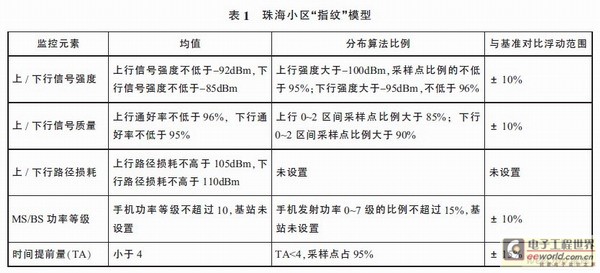 依據(jù)上述針對小區(qū)組成元素的閾值設(shè)置原理,珠海通用小區(qū)“指紋”監(jiān)控元素與閾值設(shè)置關(guān)系見表1(特別的區(qū)域如室內(nèi)覆蓋、海域覆蓋則另外設(shè)置)。