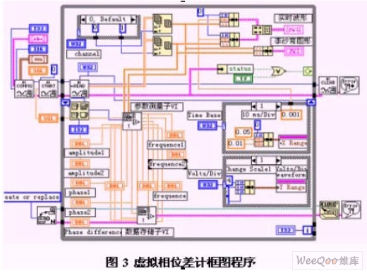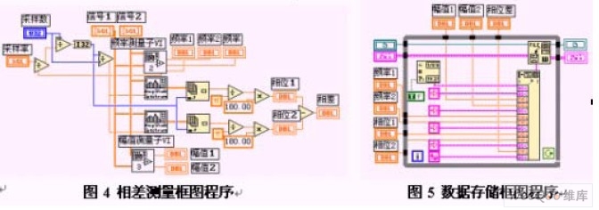 虛擬相位差計(jì)的框圖程序如圖 3 所示,它采用的是圖形化編程語言,非常直觀。該框圖 包含了波形采集、波形顯示和調(diào)整、波形測(cè)量、數(shù)據(jù)存儲(chǔ)四部分。