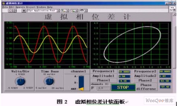 LabVIEW 提供了非常豐富的界面控件對(duì)象,可以快捷地設(shè)計(jì)出生動(dòng)、直觀、操作方便的用戶 界面。本文設(shè)計(jì)的虛擬相位差計(jì)軟面板如圖2 所示。