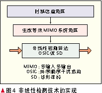 非線性檢測(cè)算法的基本實(shí)現(xiàn)步驟是:首先,通過(guò)時(shí)域信道估計(jì),估計(jì)出(N+Ng)×N階時(shí)域信道矩陣h。然后通過(guò)對(duì)接收信號(hào)的分析,生成從數(shù)字調(diào)制后數(shù)據(jù)符號(hào)到接收信號(hào)間的(N+Ng)×N階等效多輸入多輸出(MIMO)系統(tǒng)矩陣Ω,即Ω=hFN-1FN-1,其中FN-1為N階IDFT矩陣。最后利用一些已有的非線性檢測(cè)算法,如排序順序干擾抵消(OSIC)算法[11]或球形譯碼(SD)算法[12],對(duì)接收信號(hào)進(jìn)行非線性檢測(cè),恢復(fù)出原始發(fā)送信號(hào)。非線性檢測(cè)技術(shù)的實(shí)現(xiàn)框圖如圖4所示。